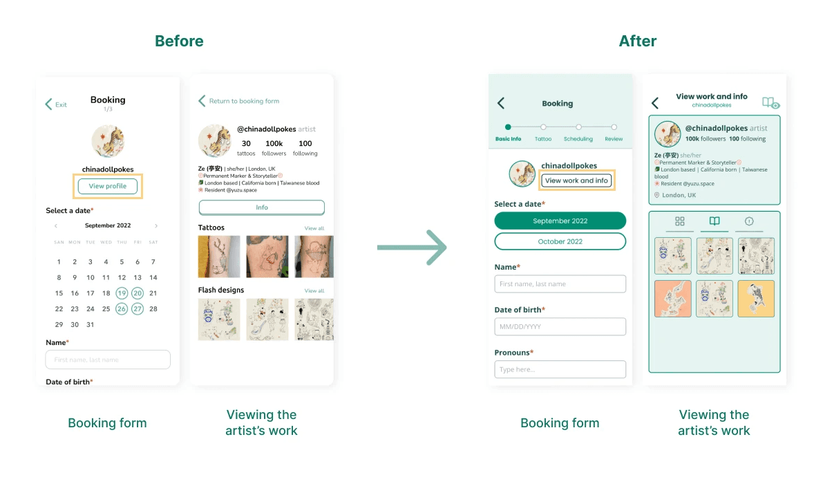 The option to choose a date is put at the very beginning of the form, which is unconventional and can put unwanted stress on the user. This was for the purpose of letting customers know when artists are available, as many artists open bookings for appointments months ahead. To address this, the date selection was moved to the last page of the form, and the customer can select only the month for their appointment in the beginning instead to get a sense fo the artist's general availability.