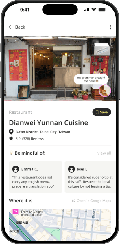 Users can view tips from other travelers and locals on etiquette, tips, etc. at specific places like restaurants and monuments.